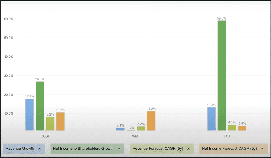 Luego, si vemos el crecimiento en las ganancias del último año, que es la barra color verde, se puede ver a Costco con 26%, Walmart 1% y Target 59%.