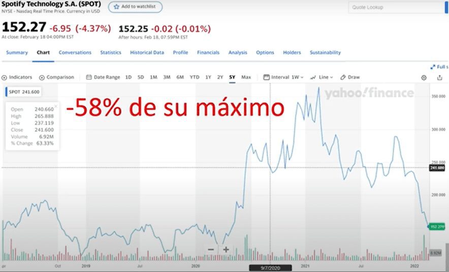Te voy a mostrar una imagen de la acción de Spotify, es una verdadera locura, esta acción estaba por encima de los $350 dólares y ahorita vale $150 dólares.