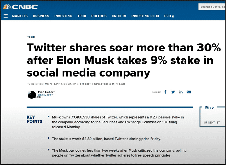 Esta es una noticia oficial que acaba de salir, dice que Elon Musk compró 9% de Twitter o 73 millones de acciones.