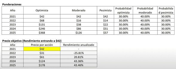 Definí una probabilidad a cada escenario, al optimista un 30% de probabilidad de que suceda, al moderado un 40% y al pesimista un 30%.