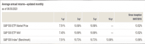 Vamos a ver un poco sobre los rendimientos que ha tenido este ETF en el pasado y te voy a mostrar una tabla donde en el primer renglón dice ETF Market Price a un año ha dado 7.5%, 3 años anualizado en promedio a dado 10% y 5 años sigue ese 10%.