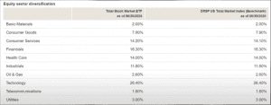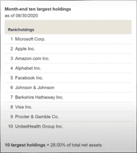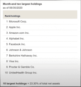 Y las 10 posiciones más grandes son prácticamente las mismas, Microsoft, Apple, Amazon, Google, Facebook, Johnson & Johnson, Berkshire Hathaway, Visa, Procter & Gamble y UnitedHealth Group representan el 23% de este fondo.