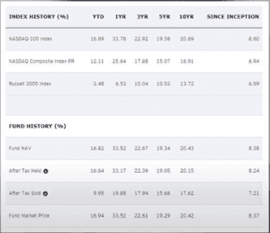 Los rendimientos que este ETF ha tenido han sido bastantes mayores a los del S&P 500, como puedes ver en esta siguiente tabla en lo que va del año el índice NASDAQ-100 da un rendimiento de 16% casi de 17%.