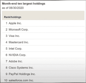 Y las posiciones más grandes en este ETF son Apple, Microsoft, Visa, MasterCard, Intel, NVIDIA, Adobe, Cisco, PayPal y salesforce.com.