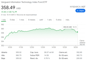 Este ETF VGT cotiza alrededor de los $358 dólares y te da un dividendo de 0.73% al año.