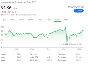 Luego, si te gusta invertir en bienes raíces hay un ETF que se llama VNQ.