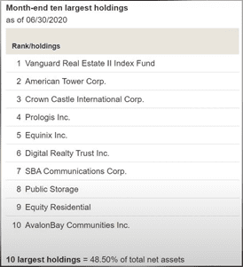 Y las posiciones más grandes de este fondo es otro ETF de Vanguard es un índice, luego esta American Tower, Crown Castle, Prologis, Equinix, Digital Realty, SBA Communications, Public Storage, Equity Residential y AvalonBay.