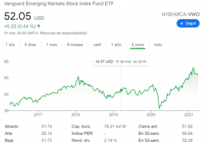 Este ETF VWO actualmente se cotiza en $52 dólares y el dividendo que paga es de 2.19% al año. También bastante interesante.