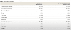 También está una tabla donde se desglosa por sector y la mayoría del S&P 500 está en el sector tecnológico que es un 27%, luego con 14% en el sector médico o de la salud, 10% en el financiero y así se va desglosando.