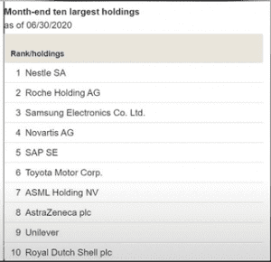Y las posiciones más grandes que manejan son Nestlé, Roche Holding, Samsung, Novartis, SAP, Toyota, ASML Holding, AstraZeneca, Unilever y Shell qué es la productora de gasolineras, petróleo, etc.