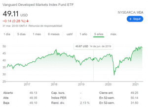 Este ETF VEA actualmente cotiza en $49 dólares aproximadamente y el dividendo que te pagan es de 2.13% al año.