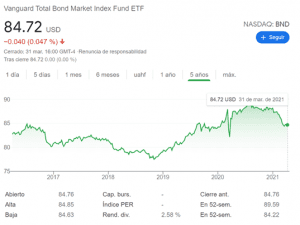 Este ETF BND actualmente cotiza en $84 dólares y también paga un dividendo de 2.58% al año.