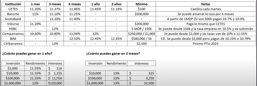 A plazo de 1 año podemos ver a compartamos con una inversión de $250,000 pesos o Banco Inmobiliario Mexicano desde $500,000 pesos.