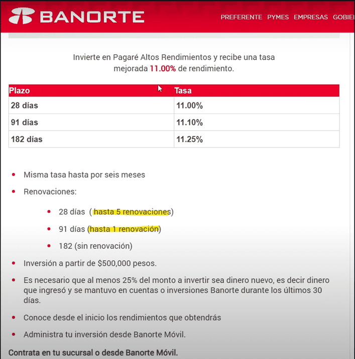 En el pagaré de Banorte que te estoy mostrando te pagan una tasa del 11% a 28 días, del 11.10% a 91 días y de 11.25% a 182 días.