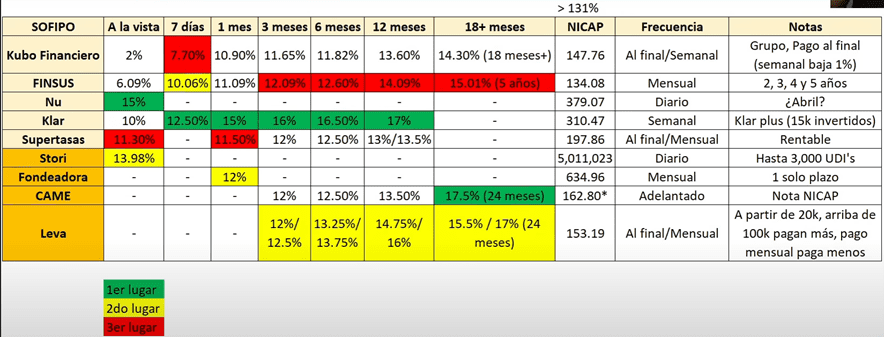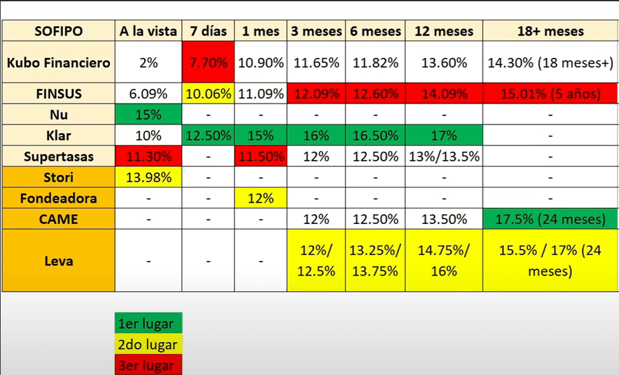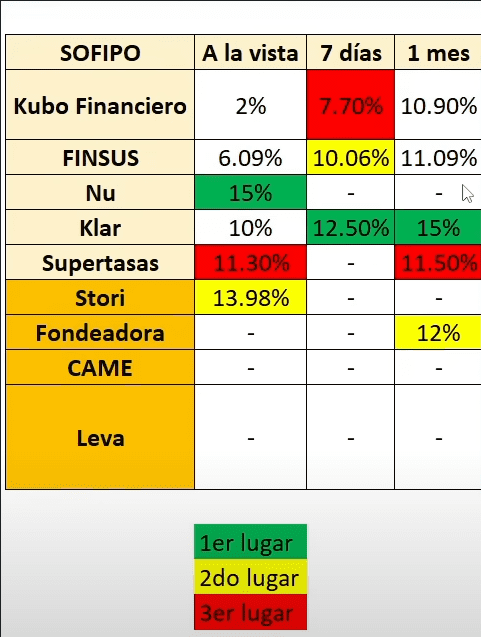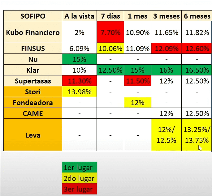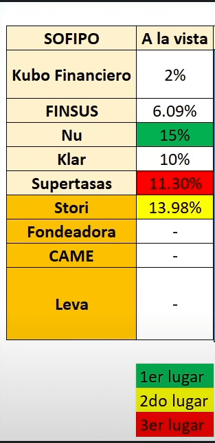 Tenemos a Kubo Financiero con 11.65%, Supertasas con 12%, luego le sigue FINSUS con el 12.09%, después Leva con un 12% o 12.5%, dependiendo el monto que inviertas.