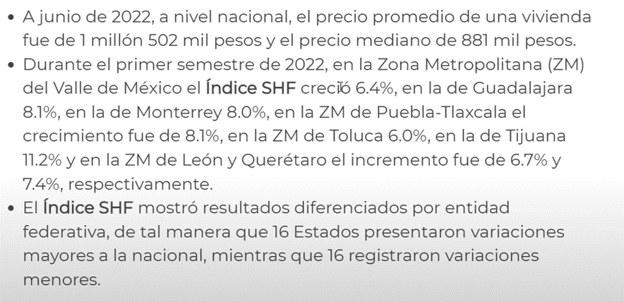 Vienen otros datos importantes, por ejemplo, a junio de 2022 el precio promedio de una vivienda era de $1.5 millones de pesos y el precio mediano de $881,000 pesos.
