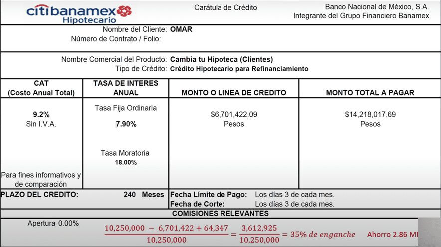 Te voy a mostrar ahora una imagen del crédito que me dieron en Banamex cuando hice el refinanciamiento.