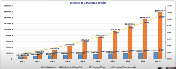 Ahora te voy a mostrar de manera gráfica todo lo que vimos de los rendimientos, donde básicamente para el año 9 recuperamos el 100% de la inversión.