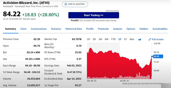 Vamos a comenzar con Activision Blizzard, cotiza alrededor de los $84 dólares, tuvo una subida después de la noticia que dieron.