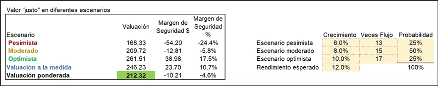 Yo estimo en diferentes escenarios que la acción debería estar a un precio justo si tú quisieras un rendimiento del 12% anual por los siguientes 10 años, entre $168 dólares a $212 dólares.