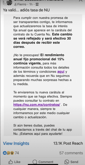 Muchas personas entendieron que la tasa no iba a bajar, otros entendieron que la tasa que iba a bajar era de la tarjeta de crédito y otros efectivamente entendieron que sí va a bajar la tasa de la cajita Nu.
