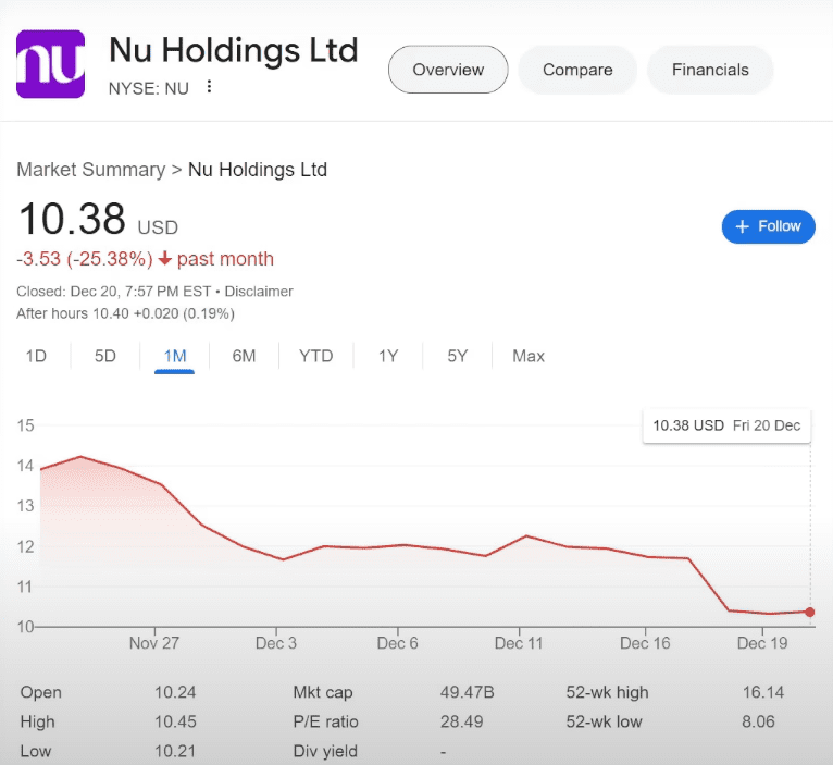 La acción de Nu se desplomó y bajo más de 30% en un par de semanas.