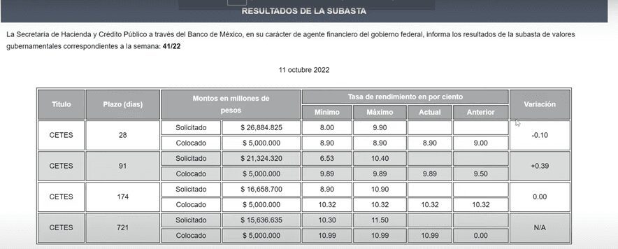 Y, por último, cetes a 2 años salió a un 10.99%, una tasa histórica, realmente pocas veces han pagado tanto.