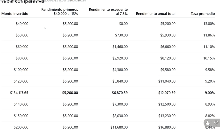 Por qué ahora el 13% sólo te lo van a pagar por tus primeros $40,000 pesos y si ya inviertes entre $40,000 y $1 millón de pesos te van a pagar el 7.3% anual.