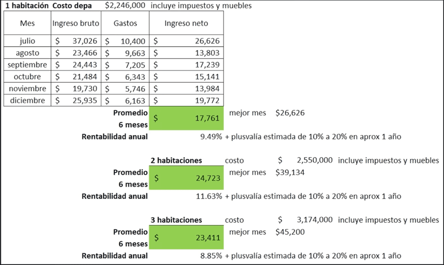Por ejemplo, yo invierto en bienes raíces, son propiedades que rento en airbnb y ganó entre un 9% y un 11% anual ya después de impuestos y gastos.