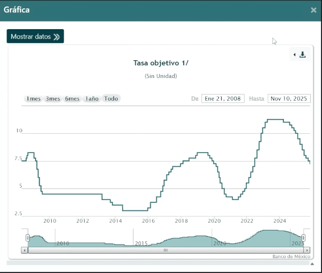 Las tasas van a seguir bajando, te voy a mostrar la gráfica de la tasa objetivo que publica Banco de México.