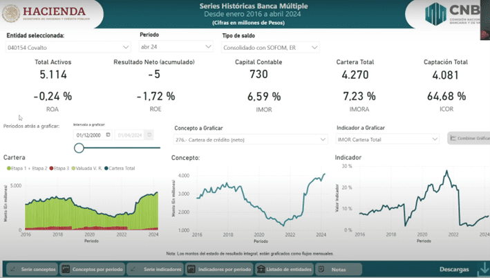 El banco en sus activos tiene más de $5,000 millones de pesos, tiene un resultado neto a abril de 2024 (que es ganancia o pérdida) de – $5 millones de pesos.