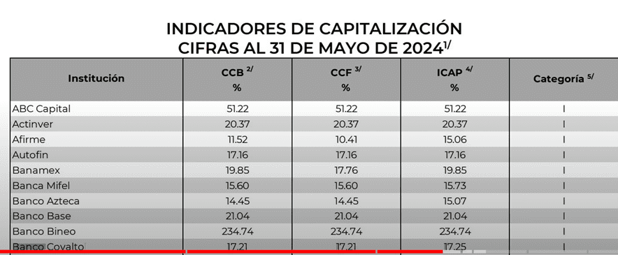 Este indicador debe ser mayor al 10.5% y por lo general todos los bancos en México están muy por encima de este porcentaje.