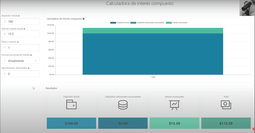 Podemos ver en la simulación anterior una inversión de $100 pesos con una tasa de interés del 13.3% invertidos a 1 año.