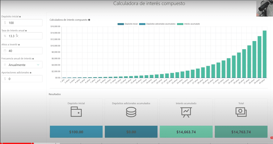 En el ejemplo vamos a invertir los mismos $100 pesos, con la misma tasa del 13.13% pero ahora por 40 años y con pagos anuales, reinvirtiendo el capital e intereses, pero cada año.