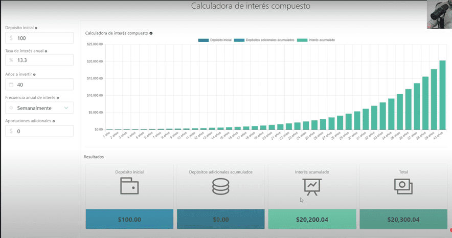 Pero ahora, si inviertes los mismos $100 pesos a la misma tasa y por los mismos 40 años y esta vez te van a pagar semanalmente y estás reinvirtiendo lo que cada semana te llega terminarías con $20,300 pesos.