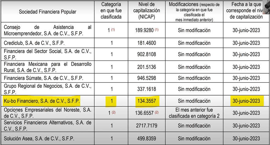 Esta información se publica en internet para todas las SOFIPOS, te voy a mostrar el de Kubo Financiero al 30 de junio de 2023.