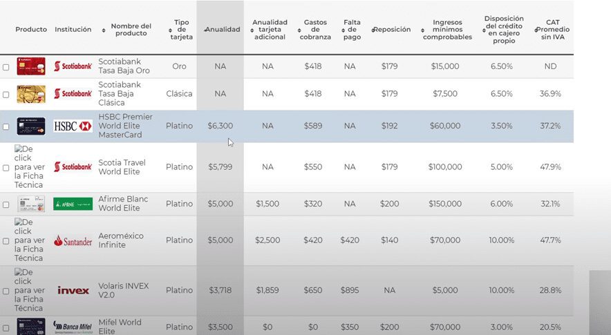 Por ejemplo, nos sale la tarjeta de HSBC Premier qué cobra una anualidad de $6,300 pesos, otra que nos aparece con una anualidad alta es de Scotiabank.