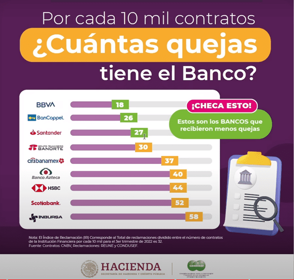 Y como mejores bancos con menos reclamaciones tenemos a BanCoppel, Santander, Afirme, Banorte y Citibanamex.