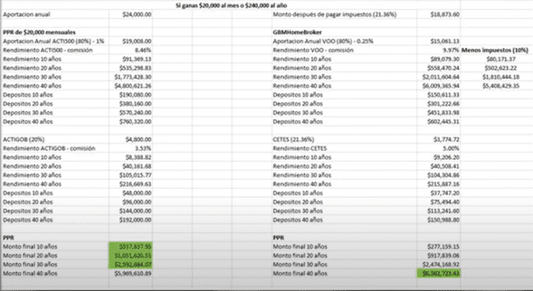 Esto es lo que queda; el PPR es la parte que está a la izquierda ahí vienen todos los montos y rendimientos a 10, 20, 30 y 40 años. Lo que depositaste para CETES como para el ACTI500.