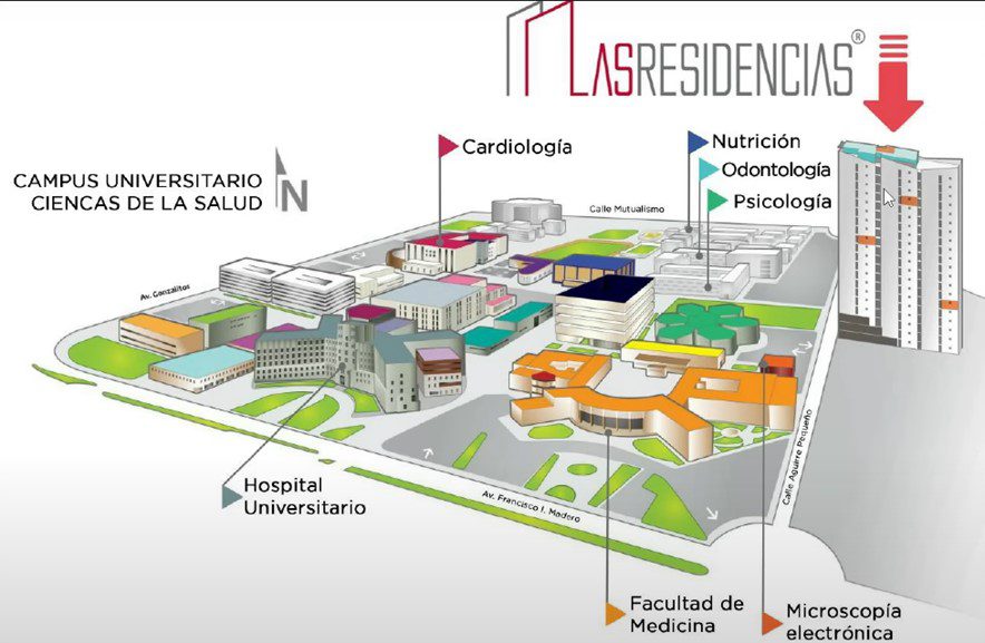 Esta torre está a 5 minutos de la Universidad Autónoma de Nuevo León, no está enfrente, pero si está cerca.