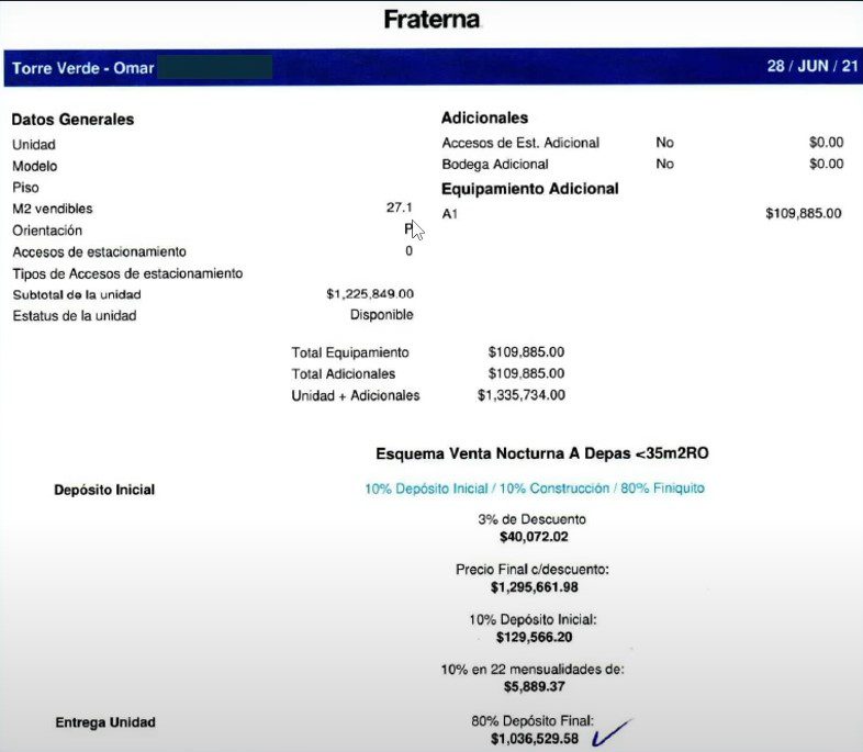 Yo logré negociar un descuento y al final me lo vendieron en 2021 a $1,295,662 pesos bajo el esquema de 10% de enganche, 10% a lo largo de 22 mensualidades de $5,800 pesos cada una y el 80% restante lo voy a liquidar cuando me lo escrituren.