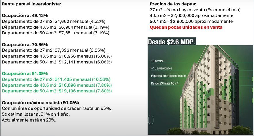 Mi departamento cuando llegue al 49% de ocupación me va a dar $4,660 pesos mensuales, cuando llegue al 70% de ocupación me va a dar $7,400 pesos mensuales y cuando llegue al 91% de ocupación me va a dar $11,405 pesos mensuales.