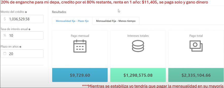Yo ya di el 20% de enganche en la preventa, si yo sacara un crédito por el 80% restante con un CAT del 10%, suponiendo que es el más bajo sería de $1,036,529 pesos.