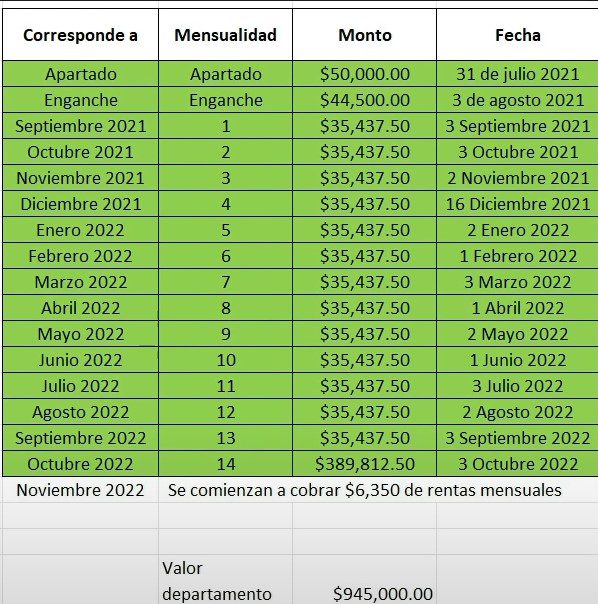 Si departamento lo hubieras liquidado de contado te lo dejaban en $850,500 pesos y equivaldría a un 9% anual en lugar del 8%.