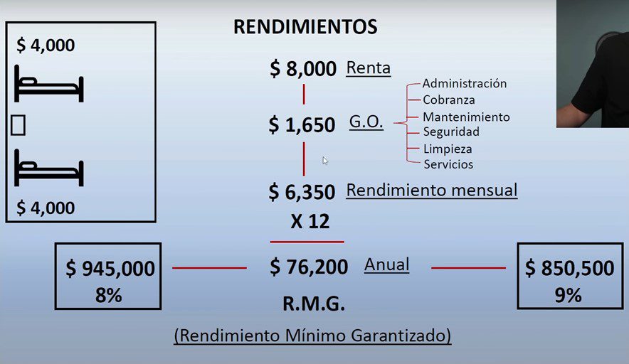 Cada cama se renta en $4,000 pesos en total las 2 suman $8,000 pesos, de eso $1,650 se van a administración, cobranza, mantenimiento, seguridad, limpieza y servicios y te quedan a ti libres $6,350 pesos al mes.