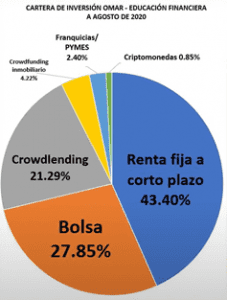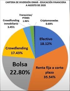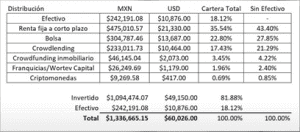 Y si quitamos el efectivo la cartera queda así, 43% en renta fija, casi 28% en la Bolsa de Valores, 21% en Crowdlending, 4% en crowdfunding inmobiliario, 2% en franquicias y aceleradoras de negocios y 0.85% en criptomonedas.