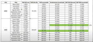 Te voy a mostrar una tabla donde muestra mis rendimientos utilizando el método de TWR que es el que cualquier fondo de inversión va a usar para poder comparar peras con peras y no tomar en cuenta las entradas o salidas de efectivo.