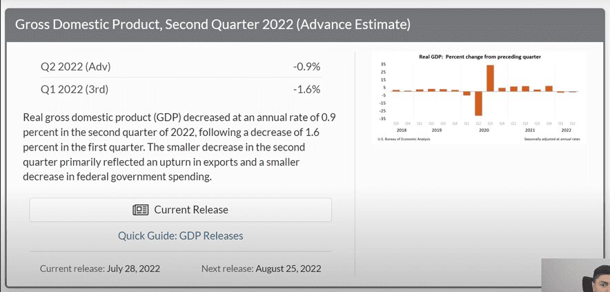 Esto se reporta cada 3 meses y cuando hay 2 trimestres consecutivos con un decremento en el GDP, como lo estamos viendo aquí en el ejemplo de Estados Unidos en los últimos 2 trimestres eso se considera una recesión técnica.