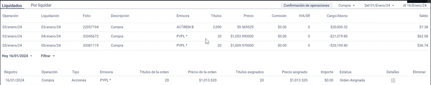 Los nuevos movimientos que hice en la bolsa durante el mes de enero fue comprar acciones de PayPal, 60 acciones en 3 lotes de 20.