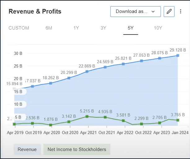 Te voy a mostrar ahora la gráfica de las ventas y ganancias de PayPal para ver cómo anda la empresa.